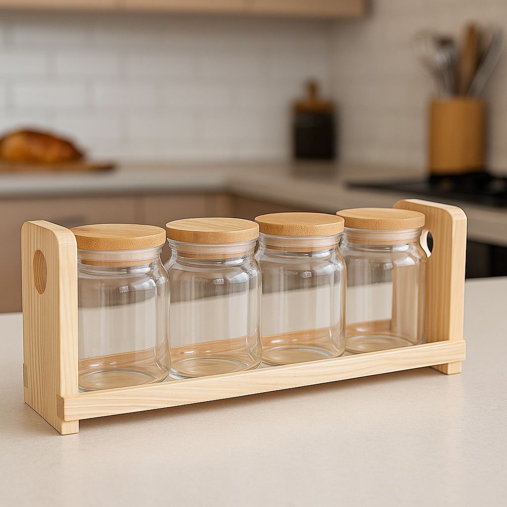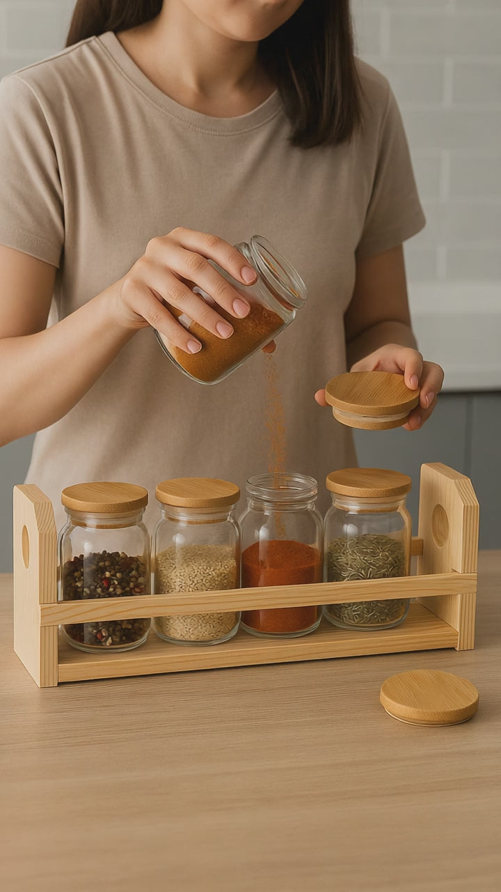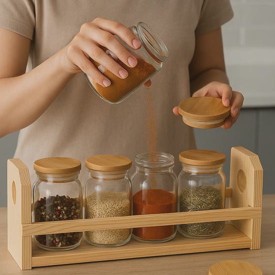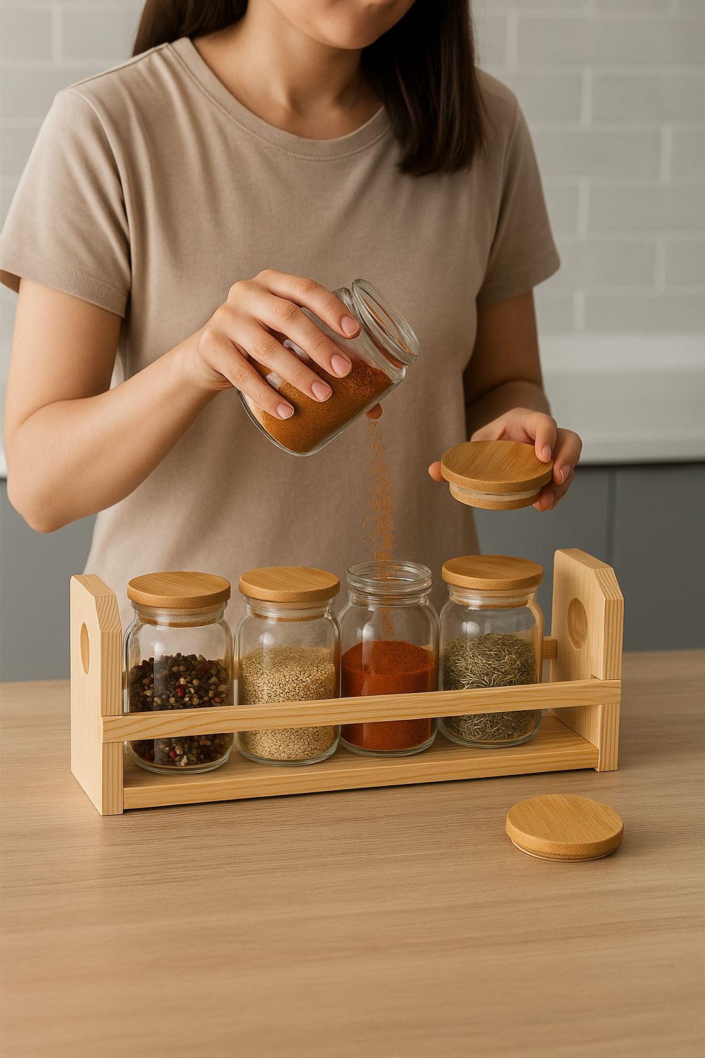 🌿 Bambu Kapaklı 4’lü Baharatlık Seti – Mutfakta düzen ve şıklığı bir arada sunan Bambu Kapaklı 4’lü Baharatlık Seti, hem günlük kullanım hem de dekoratif görünümüyle mutfağınıza estetik bir dokunuş yapar.; 🔹 Ürün Özellikleri •Doğal Bambu Kapak: Sızdırmaz silikon conta sayesinde baharatlarınızın tazeliğini uzun süre korur.; •Cam Kavanoz: Sağlıklı, kokusuz ve leke tutmayan cam malzemeden üretilmiştir.; Baharatların aromasını değiştirmez.; •Ahşap Stand: Dayanıklı ve modern tasarımlı ahşap stand, kavanozları düzenli ve şık bir şekilde saklamanızı sağlar.; •Kapasite: Her bir kavanoz günlük kullanım için ideal ölçüdedir (4 adet cam kavanoz).; 🔹 Kullanım Alanları •Tuz, karabiber, pul biber, kekik, nane, kimyon gibi baharatlarınızı saklamak için.; •Kahve, şeker veya küçük kuruyemişler için.; •Mutfakta hem düzen hem de şık sunum için.; 🔹 Avantajları •Bambu kapaklı cam tasarım, modern ve doğal bir görünüm sunar.; •Sağlıklı ve hijyenik cam yapısı, gıda ile temasa uygundur.; •Estetik tasarımı sayesinde mutfağınızda dekoratif amaçla da kullanılabilir.; •Ahşap standı ile tezgâh üzerinde yer tasarrufu sağlar.; 🔹 Bakım Talimatı •Cam kavanozlar bulaşık makinesinde yıkanabilir.; •Bambu kapak elde, nemli bir bezle silinmelidir.; •Uzun ömürlü kullanım için doğrudan suya bırakılmamalıdır.; ⸻ ✨ Bambu Kapaklı 4’lü Baharatlık Seti ile mutfağınıza düzen, sofralarınıza şıklık katın.; Kavanozlar 250 ml'dir